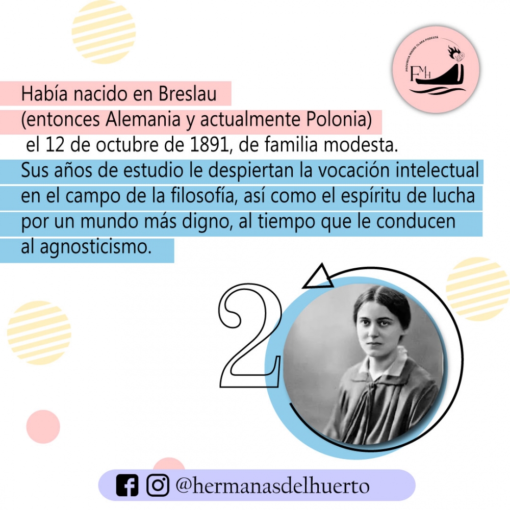 “El 9 de agosto de 1942 el tren llegaba con su carga humana al campo de exterminio de Auschwitz y los presos eran llevados directamente a las cámaras de gas. En ese tren iba una mujer judía llamada Edith Stein. Había nacido en Breslau (entonces Alemania y actualmente Polonia) el 12 de octubre de 1891, de familia modesta. Sus años de estudio le despiertan la vocación intelectual en el campo de la filosofía, así como el espíritu de lucha por un mundo más digno, al tiempo que le conducen al agnosticismo. Luego, la guerra europea la enfrenta al drama del sufrimiento y la muerte, ante el que Edith reacciona dedicando energías y entrega como enfermera auxiliar. Y le lleva a replantearse el sentido de la vida, que redescubre leyendo las obras de Teresa de Jesús. Con la oposición de su madre, recibe el bautismo en la Iglesia católica. Edith entra de lleno en tareas de docencia, en actividades feministas y en la profundización de su fe. Hasta que triunfan en Alemania el fanatismo y el odio racial nazi. Edith actúa al servicio de su pueblo judío, hasta que experimenta que sólo le queda un camino: la entrega de su propia vida. Entra en el Carmelo de Colonia, donde recibe el nombre de Teresa Benedicta de la Cruz, y sigue trabajando en el campo de la filosofía. Pero al final, cuando todo se hunde y la condición judía en Alemania implica sistemáticamente la persecución y la muerte, debe huir a Holanda. Allí, en el Carmelo de Echt, es acogida con los brazos abiertos. Pero al cabo de dos años y medio es detenida y conducida al martirio. Juan Pablo II la canonizó en el año 1998 y la incorporó luego al grupo de santos y santas patronos de Europa..” 2