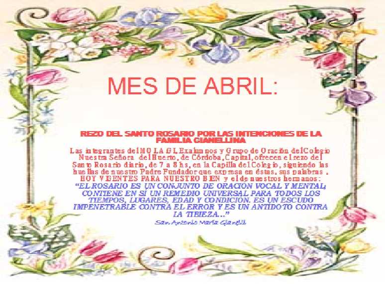 Las integrantes de MOLAGI, Exalumnos y Grupo de oración del colegio Nuestra Señora del Huerto de Córdoba ofrecen el rezo del Santo Rosario diario, de 7 a 8 Hs, en la Capilla del Colegio, siguiendo las huellas de nuestro Padre Fundador