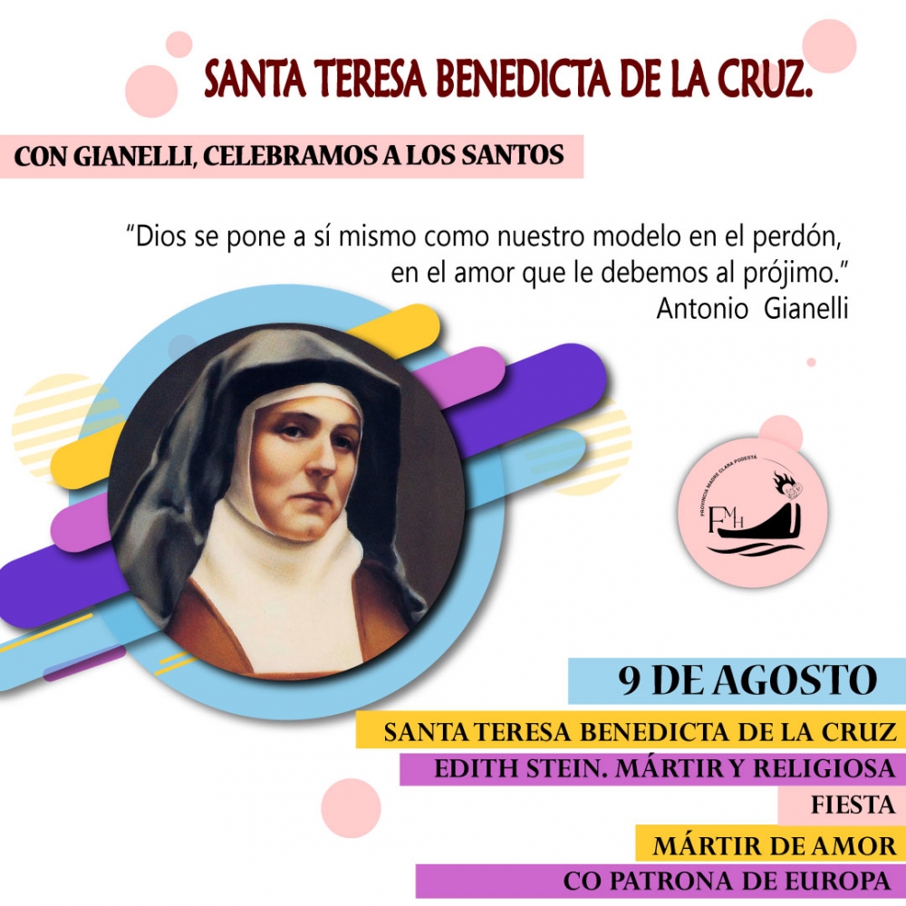 “El 9 de agosto de 1942 el tren llegaba con su carga humana al campo de exterminio de Auschwitz y los presos eran llevados directamente a las cámaras de gas. En ese tren iba una mujer judía llamada Edith Stein. Había nacido en Breslau (entonces Alemania y actualmente Polonia) el 12 de octubre de 1891, de familia modesta. Sus años de estudio le despiertan la vocación intelectual en el campo de la filosofía, así como el espíritu de lucha por un mundo más digno, al tiempo que le conducen al agnosticismo. Luego, la guerra europea la enfrenta al drama del sufrimiento y la muerte, ante el que Edith reacciona dedicando energías y entrega como enfermera auxiliar. Y le lleva a replantearse el sentido de la vida, que redescubre leyendo las obras de Teresa de Jesús. Con la oposición de su madre, recibe el bautismo en la Iglesia católica. Edith entra de lleno en tareas de docencia, en actividades feministas y en la profundización de su fe. Hasta que triunfan en Alemania el fanatismo y el odio racial nazi. Edith actúa al servicio de su pueblo judío, hasta que experimenta que sólo le queda un camino: la entrega de su propia vida. Entra en el Carmelo de Colonia, donde recibe el nombre de Teresa Benedicta de la Cruz, y sigue trabajando en el campo de la filosofía. Pero al final, cuando todo se hunde y la condición judía en Alemania implica sistemáticamente la persecución y la muerte, debe huir a Holanda. Allí, en el Carmelo de Echt, es acogida con los brazos abiertos. Pero al cabo de dos años y medio es detenida y conducida al martirio. Juan Pablo II la canonizó en el año 1998 y la incorporó luego al grupo de santos y santas patronos de Europa..” 2