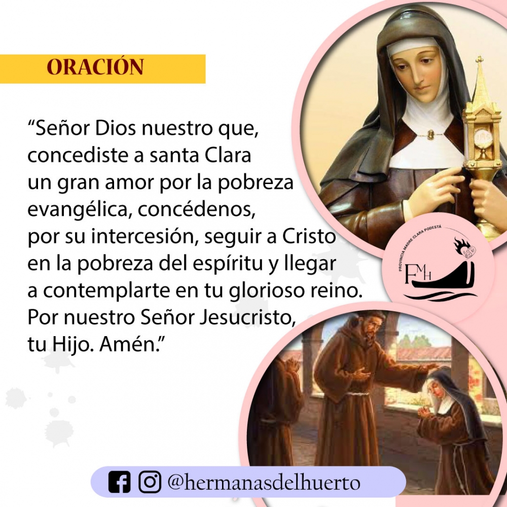 “Señor Dios nuestro que, concediste a santa Clara un gran amor por la pobreza evangélica, concédenos, por su intercesión, seguir a Cristo en la pobreza del espíritu y llegar a contemplarte en tu glorioso reino. Por nuestro Señor Jesucristo, tu Hijo. Amén.” 3