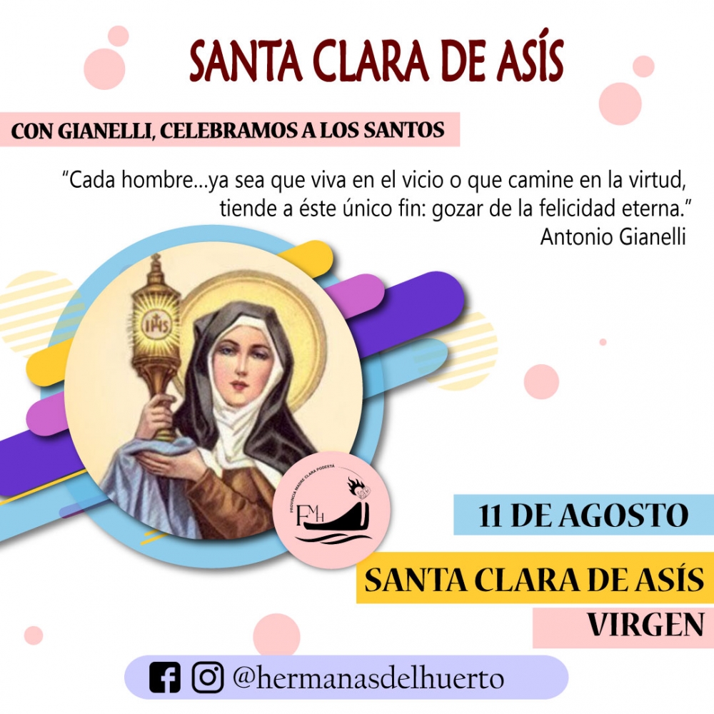 “Fue voluntad de Dios que aquel gran seguidor suyo que fue Francisco de Asís, hallara una compañera espiritual a su altura: Clara de Asís. Aunque es muy posible que fuera Clara la que, de los dos, más fuerza y decisión necesitó para seguir y defender aquel revolucionario camino de renovación evangélica que tenía en el amor y la pobreza sus grandes bases. En Asís, a los dieciocho años, deja su rica familia, y hace que Francisco le corte los cabellos como signo de decisión radical: vivir para siempre sólo para Dios, no en un confortable monasterio sino en una casa en ruinas. Se inicia así el camino de la segunda orden franciscana, las Damas Pobres que luego serían conocidas como las “clarisas”. Muerto Francisco, enferma ella, su lucha sigue para defender el privilegio de la pobreza incluso ante las reticencias de papas y obispos. En sus escritos se nos ha conservado la riqueza evangélica de su amor amable abierto a todos. Murió el 11 de agosto de 1253.” 2