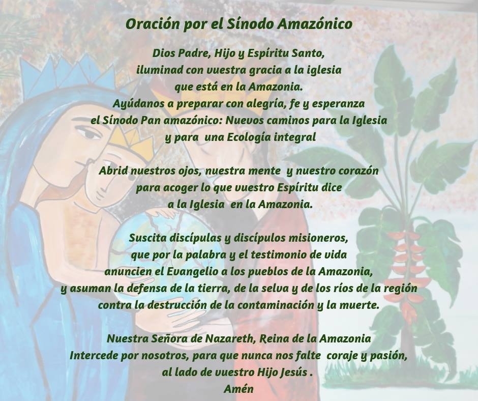 ORACIÓN POR EL SÍNODO DE LA AMAZONIA Dios Padre, Hijo y Espíritu Santo, iluminad con vuestra gracia la Iglesia que está en la Amazonia. Ayúdanos a preparar con alegría, fe y esperanza el Sínodo Pan-Amazónico: “Amazonia: nuevos caminos para la Iglesia y para una ecología integral”. Abre nuestros ojos, nuestra mente y corazón para acoger lo que vuestro Espíritu dice a la Iglesia en la Amazonia. Haced surgir discípulas y discípulos misioneros, que, por la palabra y el testimonio de vida, anuncien el Evangelio a los pueblos de la Amazonia, y asuman la defensa de la tierra, de la vegetación y de los ríos de la región, contra la destrucción, la contaminación y la muerte. Nuestra Señora de Nazaret, Reina de la Amazonia, intercede por nosotros, para que nunca nos falten el coraje y la pasión, lado a lado con tu Hijo Jesús. Amén!